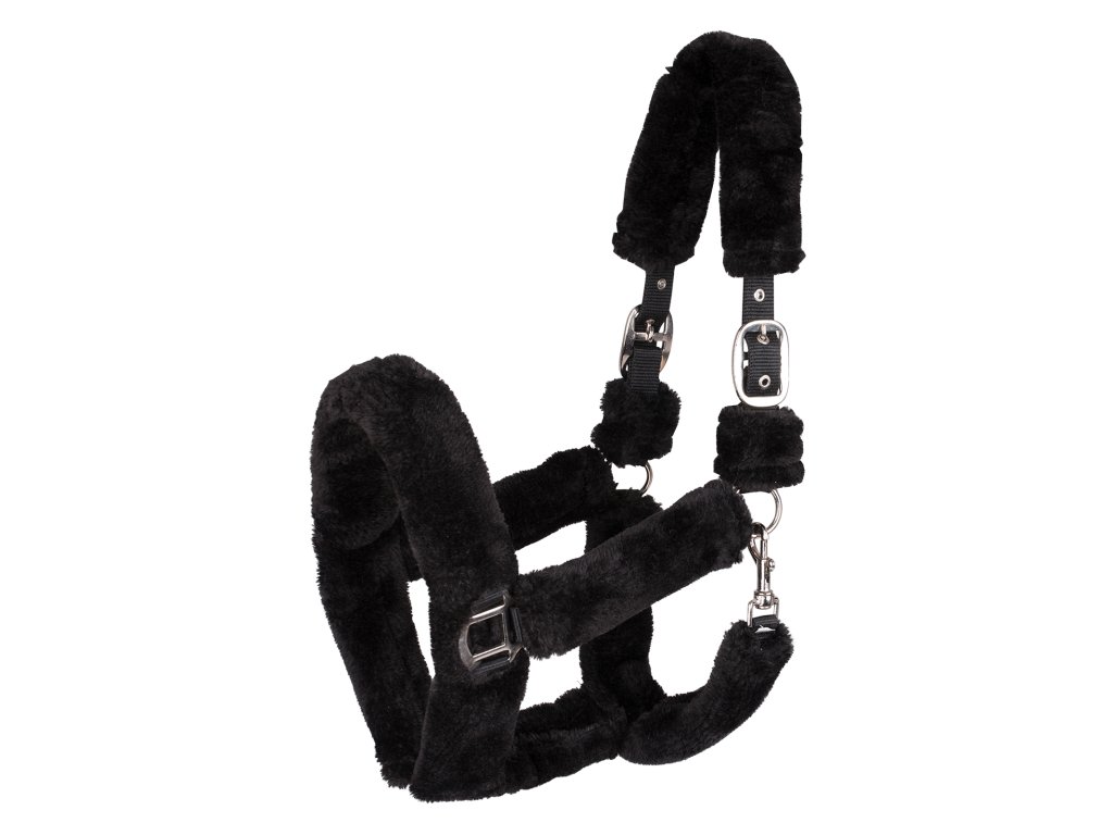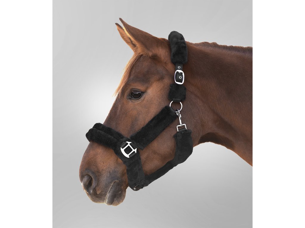 - Kvalitní ohlávka polstrovaná měkkým syntetickým beránkem v černé barvě.
