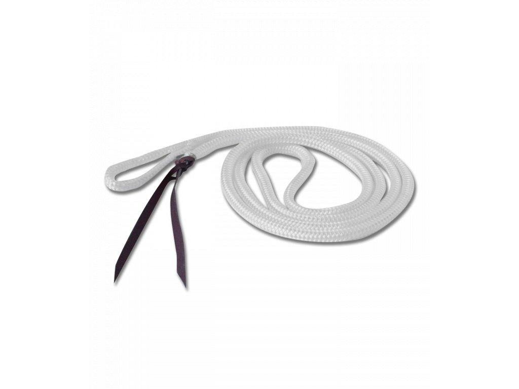 - Ethologické vodítko bez karabiny z jemného nylonu a s koženým švihem na konci.